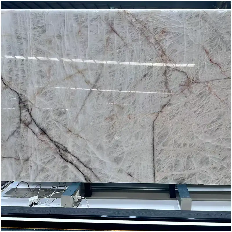 Ce qui rend ce quartzite particulièrement intéressant, c'est sa compatibilité avec l'éclairage. En tant que Dalles de quartzite rétro-éclairéesEn outre, elle peut être transformée en une surface lumineuse qui donne une impression de sophistication et d'atmosphère, en particulier dans les zones d'accueil, les environnements de spa, les bars et les murs d'apparat. La douce transmission de la lumière à travers les parties les plus claires de la pierre crée un effet spectaculaire sans être visuellement écrasant. Pour les architectes et les décorateurs d'intérieur, cela permet au matériau de fonctionner non seulement comme une finition de surface, mais aussi comme un élément de design expressif doté d'une forte présence émotionnelle.